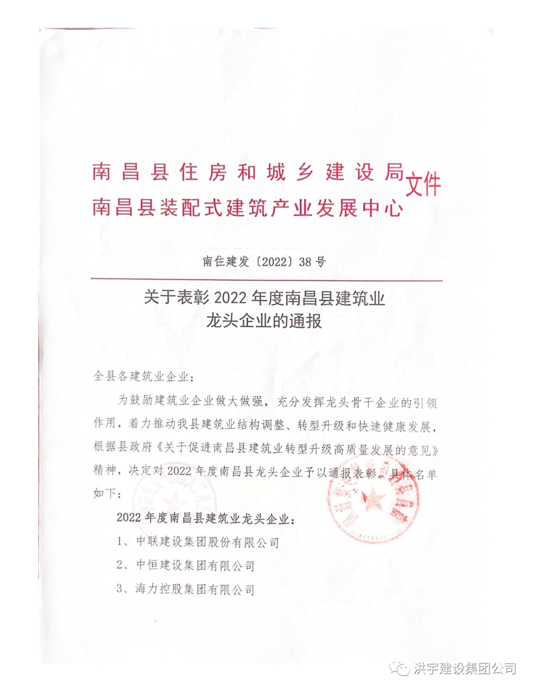 洪宇建設(shè)集團(tuán)公司榮獲南昌縣建筑業(yè)“龍頭企業(yè)”稱號