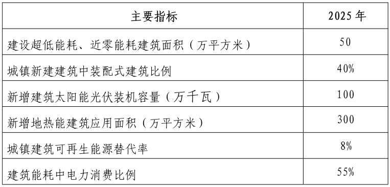 (注:表中指標(biāo)均為預(yù)期性指標(biāo))2.具體目標(biāo)。到2025年,建設(shè)超低能耗、近零能耗建筑50萬平方米以上,裝配式建筑占當(dāng)年城鎮(zhèn)新建建筑的比例力爭達(dá)到40%,全省新增建筑太陽能光伏裝機(jī)容量100萬千瓦以上,地?zé)崮芙ㄖ?yīng)用面積300萬平方米,城鎮(zhèn)建筑可再生能源替代率達(dá)到8%,建筑能耗中電力消費(fèi)比例超過55%。專欄2 “十四五”時(shí)期建筑節(jié)能和綠色建筑發(fā)展具體指標(biāo)(注:表中指標(biāo)均為預(yù)期性指標(biāo))